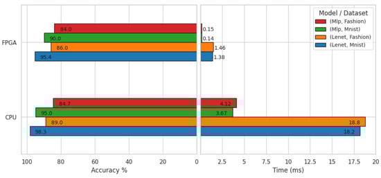The processing time of 10,000 MNIST images on the CPU, where no quantization or folding was applied, was observed as 18.2 s for LeNet and 3.6 s for MLP. However, with W1A1 quantization and H folding level applied on the FPGA, the processing time was significantly reduced to 1.4 s for LeNet and 0.014 s for MLP, as illustrated in Figure 16. Additionally, the accuracy values shown in the graph indicate that LeNet achieves 95.4% accuracy on the FPGA and 98.3% on the CPU for the MNIST dataset, while MLP achieves 90.0% accuracy on the FPGA and 95.0% on the CPU. These results demonstrate that while there is a slight trade-off in accuracy when using FPGA optimizations, the reduction in processing time is substantial, making FPGA a highly efficient option for scenarios prioritizing speed over marginal accuracy loss.