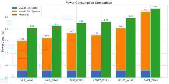 The final part of the performance evaluation includes the power consumption of all models in both simulation and practice. The power analysis of the designed accelerators was conducted using the power estimation tool in the Xilinx Vivado 2021.2 software. Figure 18 presents the power consumption of the models from practical measurements and Vivado tool. The power consumption of accelerators is divided into two groups, dynamic and static, according to the type of consumption, and dynamic consumption is further partitioned into five components. The first four of these components represent the resources consumed by the accelerator: clock, signals, logic elements, and memory units. The last one is the power consumed by the operating system. Static consumption remained at a low level of 0.138–0.189 W in all three accelerators. In dynamic power consumption, approximately 82% of the total power consumption is consumed by the operating system that controls the Pynq Z1 card. Analyses based on different quantization levels show that increasing the quantization level results in enhanced total power consumption. The W2A2 model with the highest power expenditure consumes 2.85 W, which can be treated as a very small value in comparison to hardware such as CPU or GPU. It can be noted that the actual power consumption is 0.5 W higher than Vivado estimates due to the limited calculation of Vivado with FPGA and the operating system. However, the PYNQ Z1 card has extra input and output hardware components other in addition to FPGA.
