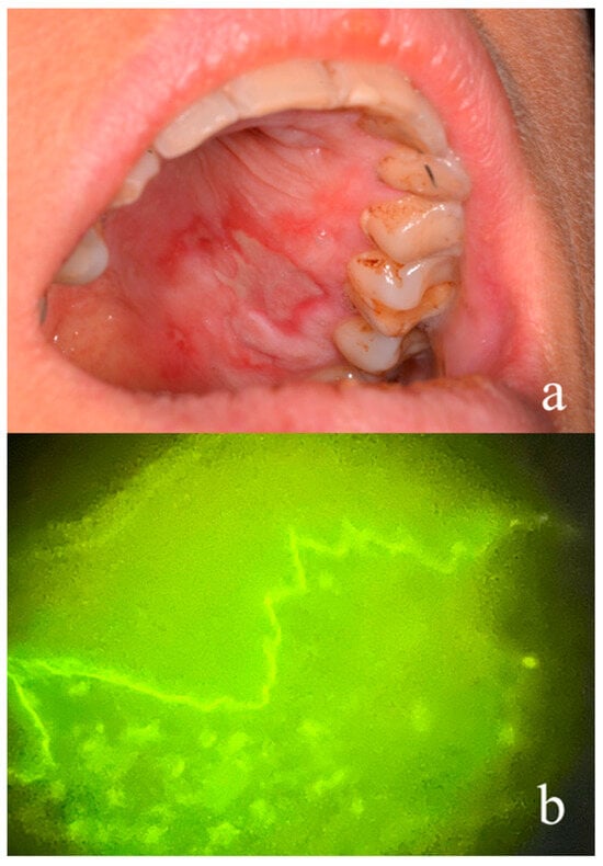 The medical records of all patients diagnosed and treated for OMMP (from July 2017 to April 2024) were reviewed after the approval by the local ethics committee: Comitato Etico Area vasta Emilia Centro with code OBLI01 (CE 22206). All patients or their legal guardians provided informed consent for the investigations required for the diagnostic work-up, in accordance with good clinical practice. The study was conducted in compliance with the principles of the Declaration of Helsinki. To be included, patients had to display (1) a histological diagnosis of OMMP based on direct immunofluorescence (DIF) displaying linear deposits of IgG and/or C3 in the epithelial basal membrane zone (Figure 1a,b); (2) levels of circulating anti-BP180 IgG measured at diagnosis using the same available ELISA kit (Euroimmun, Lubeck, Germany cut-off 20 U/mL); and (3) the absence of extraoral involvement.