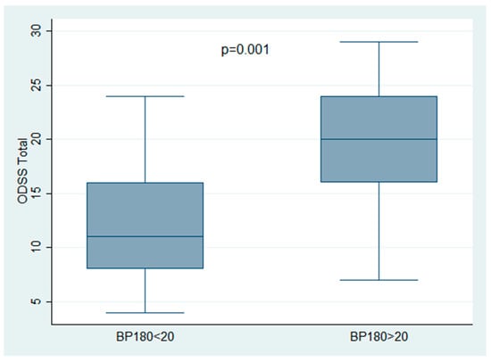 The ODSS in patients with values of BP180 ELISA > 20 U/mL was found to be statistically greater compared to patients with lower titers of circulating anti-BP180 (19.47 ± 6.70 vs. 12.44 ± 5.40 p = 0.001). (Figure 2).