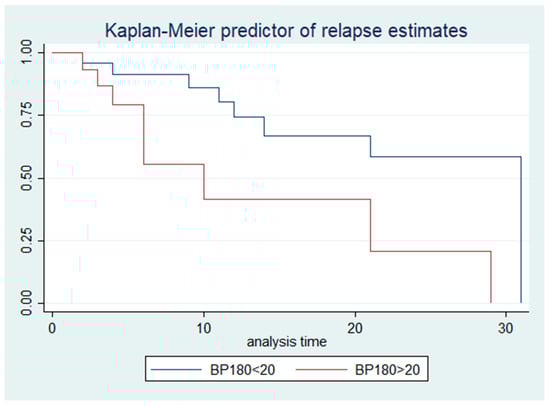 Cox proportional hazard model analysis showed that BP180 ELISA > 20 U/mL was the only variable associated with relapse in the multivariate analysis (HR 3.4; p = 0.01). In particular, 9/17 patients with BP180 ELISA > 20 U/mL experienced relapse in a mean time of 9.66 ± 9.20 months compared to 8/17 patients below the cut-off (mean time to relapse: 13.0 ± 9.09 months) (Figure 3). See Table 2 for details.
