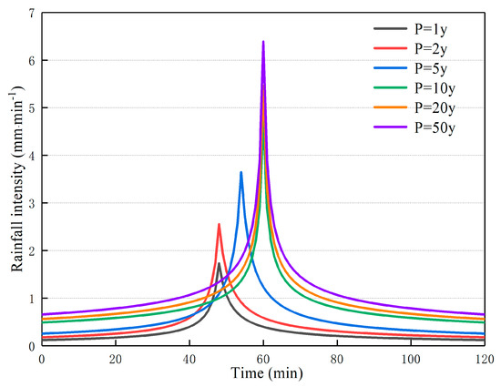 The Chicago rainfall pattern model [37] was employed to construct a non-uniform rainfall process. This model enables the design of various non-uniform, single-peak rainfall patterns based on rainfall intensity, duration, and frequency, facilitating a more accurate simulation of substantial rainfall characteristics and processes in Wuhan. A total rainfall duration of 120 min was set, with intervals of 1 min. The rainstorm intensity for Wuhan [38] can be calculated as follows: