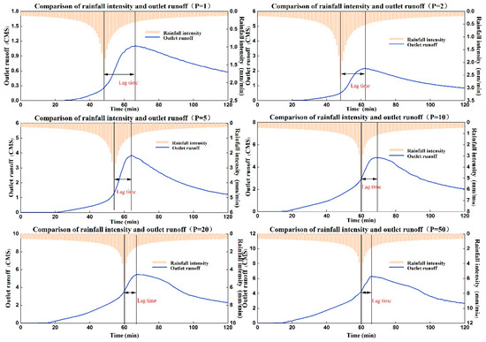 Comparison of rainfall intensity and outlet runoff for different return periods.