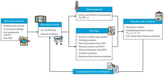 As mentioned above, this study has focused on assessing the thermal comfort in classrooms in two university buildings in a Mediterranean climate zone during the transition between spring and summer 2022. For this purpose, two modes of operation were analysed: natural ventilation and air conditioning. Environmental measurements were taken indoors and outdoors, collecting data on temperature, relative humidity and air velocity. In addition, surveys were administered to students that included personal variables, subjective thermal perceptions, questions about their position in the classroom and academic aspects. All data collected were subjected to descriptive analysis and calculation of key thermal parameters, complemented by a case study focusing on the spatial distribution within the classrooms, allowing comparison of the two modes of operation and concluding thermal comfort in educational environments.