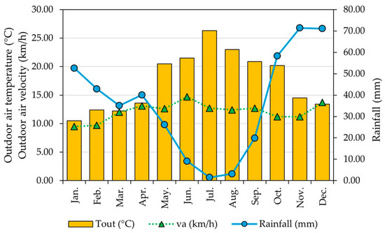 Beja is located in the southern interior of Portugal (38°00′56″ N, 7°51′55″ W) and, according to the Köppen–Geiger climate classification, it belongs to the Csa category, corresponding to a Mediterranean climate with dry summers and mild winters [6]. Average monthly temperatures can exceed 35 °C in summer, while in winter, they rarely fall below 10 °C, reflecting a moderate annual temperature range [22]. Annual rainfall is low and mainly concentrated in the winter months. Figure 2 shows the temperature profile, air velocity and precipitation in 2022 in Beja.