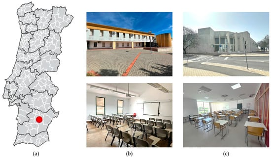 Figure 3 shows the location of the city of Beja and the buildings in which the tests were carried out, accompanied by a representative image of the classrooms studied, while Table 1 shows the characteristic summary of the classrooms selected for this study.
