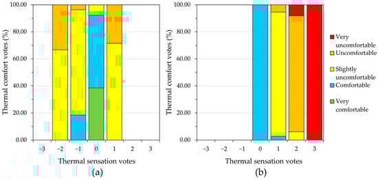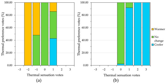 In this case, Figure 5 presents the cross-tabulation of the thermal preference votes about the perceived thermal sensations in both modes of operation. In AC mode (Figure 5a), the mean TPV was 0.19. In neutral thermal sensations (0), most students voted for “No change”, indicating satisfaction with the perceived temperature. However, in slightly cool thermal sensations (−1), a little more than half of the students (51.85%) preferred a “Warmer” environment. For cold thermal sensations, this percentage rises to 100%. For slightly warm thermal sensations (1), a significant percentage expressed a preference for a “Cooler” environment. For the NV mode (Figure 5b), the average TCV was −0.76, indicating that, in general, students preferred a “Cooler” thermal environment. For neutral thermal sensations (0), most students preferred “No change”, indicating that these conditions are perceived as adequate. As the thermal sensations become warmer (1, 2 and 3), the preference for a “Cooler” environment increases dramatically, reaching 100% for extreme heat sensations (3). Overall, the results indicate that the AC mode allows a more consistent balance of thermal preferences to be maintained, as it satisfies the majority of occupants in neutral and moderately warm conditions. In contrast, the NV mode shows a clear tendency towards thermal dissatisfaction when temperatures rise, evidenced by a predominant preference for cooler environments in warm thermal sensations.