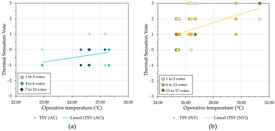 Linear regression between the thermal sensation vote and operating temperature in (a) AC mode and (b) NV mode.