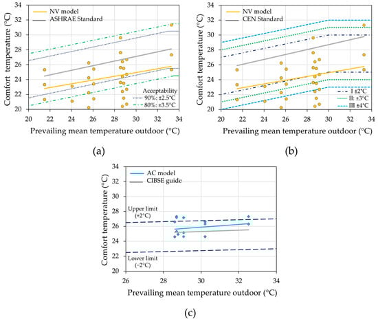 In the AC tests, the Tn, defined as the operative temperature at which the mean TSV is zero, was 25.80 °C. According to the 7-point scale of the ASHRAE 55 standard, the thermal acceptance range for 90% of the participants is between −0.5 and 0.5, which corresponded to a temperature range between 24.20 and 27.40 °C. For 80% acceptability, the range extends from −1 to 1, with temperature limits for this case between 22.60 and 29.00 °C. While in the NV mode, the Tn was 22.00 °C, with a comfort range of 90% acceptability between 20.00 and 24.00 °C and 80% acceptability between 18.00 and 26.00 °C. As can be seen, the Tn calculated for the AC tests is significantly higher compared to the NV tests. This could reflect that, in controlled environments, users have a higher tolerance to slightly higher temperatures [69,70]. In the research carried out by Haddad et al. [71] and Teli et al. [66] in this type of climate and with NV, temperatures very similar to those calculated in this work were obtained.