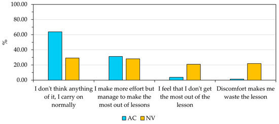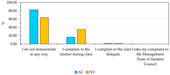About the actions students take in the face of thermal discomfort, two specific questions were asked. The first question asks how this discomfort affects following the class, with response options ranging from “I don’t mind, I continue as normal” to “The discomfort makes me miss the class”. The second question focuses on who they address their complaints to in situations of thermal discomfort, with options such as: “I do not make any kind of statement”, “I complain to the teacher during class”, “I complain to the class delegate” and “I raise my complaint to the Management Team or Student Council”.