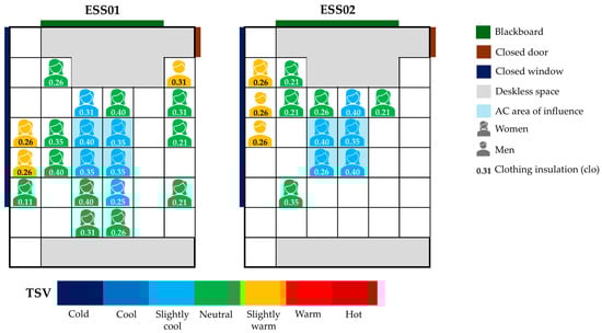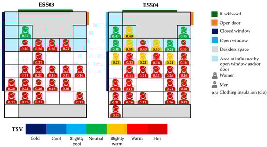 As shown in Table 4, a total of 276 questionnaires were completed, of which 274 were valid: 191 in ESE and 83 in ESS. The remaining two questionnaires were discarded due to inconsistencies in the responses. Regarding gender, in ESE, 44.50% were male, 55% were female and 0.50% were identified in another category. In the case of ESS, 6% were male and 93% female. Regarding age, the majority of students (83.8% in ESE and 86.7% in ESS) were between 18 and 24 years old. All the students surveyed remained seated during the lessons given by the teachers, which made it possible to establish a metabolic rate of 70 W/m2 (1.2 met), as stipulated in the ASHRAE standard 55 [2]. The average clothing insulation (Iclo) was calculated based on the type of clothing worn by the respondents at the time of testing, as indicated by each respondent in the questionnaires. In this case, the thermal insulation of the chair has not been considered, as the impact of contact surfaces is minimal compared to the insulation provided by the clothing [56]. Thus, the mean Iclo was slightly higher for ESE students (0.33 clo) than for ESS students (0.25 clo). In both schools, the most common combination of clothing included long trousers, tank tops in the case of females, and short-sleeved T-shirts or shirts in the case of males, complemented by trainers. In many cases, they also chose to wear shorts.