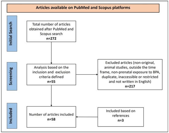 The narrative review was performed by three different authors who performed the literature search of published articles available on PubMed and Scopus platforms, according to the inclusion and exclusion criteria presented below. Specific keywords (Table 1) were used regarding maternal–foetal effects of exposure to bisphenol A, and the results were limited to articles published in the last 10 years (until June 2024). Using the Boolean operators AND and OR, a combination of the following keywords was used:
