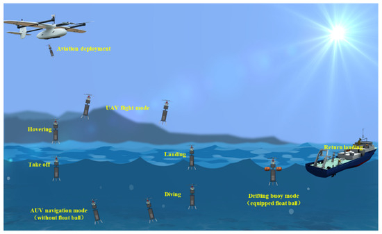 In recent years, with the development of science and technology and the traction of marine resource exploitation demand, marine robots, such as ocean unmanned aerial vehicles (UAVs) [1], unmanned surface vehicles (USVs) [2], ocean buoys (OBs) [3], and unmanned underwater vehicles (UUVs) [4], have been rapidly developed and achieved great success. This technology is increasingly playing an important role in marine surveillance, offshore rescue, resource exploration, and even military operations. As research results on diverse marine robots continue to emerge, researchers are beginning to think of and design new robots for seemingly impractical amphibious tasks. The hybrid aerial–underwater vehicle (HAUV), which is capable of performing air and water amphibious missions, belongs to a new concept of amphibious vehicles. The concept of amphibious vehicles can even be traced back to the 1930s, when the United States Navy and the Soviet Union, respectively, conceived of flying submarines and underwater aircraft [5] and carried out a series of studies [6,7], but early research was not smooth. After decades of silence, with the progress of marine robotics technology and the increasingly urgent demand for amphibious missions, the development and testing of prototype HAUVs and the pre-research of related technologies have attracted more and more scholars’ research interest.