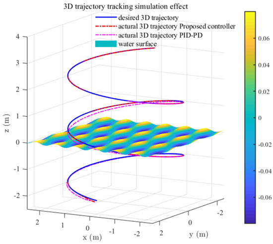 In this study, nonsingular modeling and cross-domain trajectory tracking control problems for a special class of coaxial hybrid aerial–underwater vehicles (HAUVs) are investigated. Coaxial HAUVs need to effectively overcome the influence of hydrodynamic factors when moving underwater, so the attitude angle required by coaxial HAUVs is much larger than that in the air. The attitude representation based on quaternion modeling is adopted to avoid the inherent singularity of Euler angle modeling. A cascade sliding mode control and proportion differentiation (SMC-PD) controller is proposed, which is used to position trajectory and attitude quaternion tracking control, respectively. An adaptive sliding mode controller based on disturbance observer (DO) enhancement is adopted in the outer loop to carry trajectory tracking control. At the same time, the expected attitude angle is calculated by the outer loop (position) and is converted into the expected quaternion. With reference to the idea of enhanced robustness in active disturbance rejection control (ADRC), a feedforward proportion derivation (PD) controller based on DO enhancement is used to track the desired quaternion. A variable parameter adaptive algorithm based on the learning rate is introduced in the cascaded SMC-PD controller. The error convergence speed of the system is further improved by adaptively changing the controller parameters. The stability of the proposed control scheme is proved by using the Lyapunov theory. The numerical simulation results show that the controller has good robustness and effectiveness.