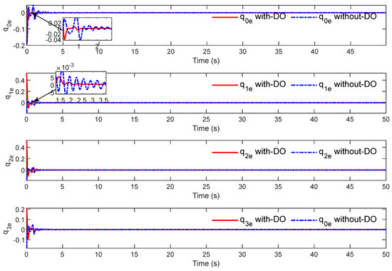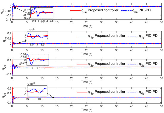 Figure 18 and Figure 19 show the attitude-tracking effect of the proposed inner loop controller; it can be observed that the HAUV tracks the desired Euler angle quickly, and the four parameters of the quaternions can accurately track the expected quaternions. At the same time, Figure 20 shows the tracking error of the quaternion and the fluctuation of the error in a small neighborhood of 0. The above results show that the controller based on observer enhancement technology can obtain a better tracking effect in both steady-state error and convergence characteristics.