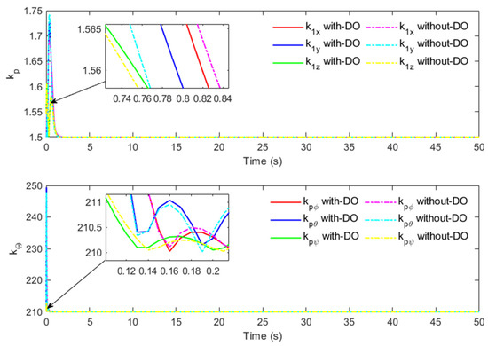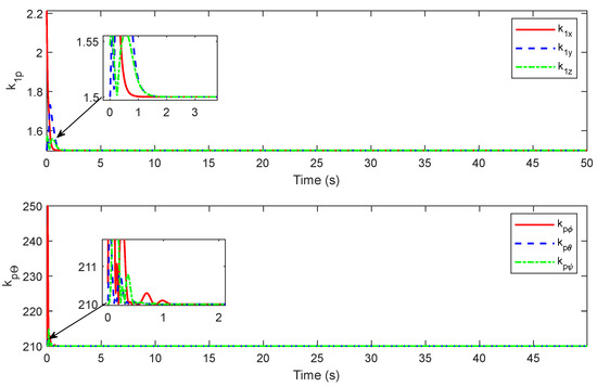 Figure 21 shows the change process of the learning rate parameter under working case 2. In addition to the rapid increase in parameters in the initial stage, the learning rate parameters in the whole process are stable near the initial value, indicating that the control error of the controller is very small. Figure 22 shows the evolutionary effects of position and attitude-tracking errors. It is obvious that the controller with DO has better error convergence characteristics. Figure 23 shows the change process of the control signal after calculation. It can be seen that in the process of cross-media simulation, the changes in the four control inputs are stable and can be changed in real time according to the control target, and the control signal output of the adopted controller is more accurate.