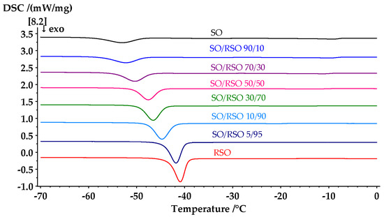 The phase transitions in the investigated plant oil and their mixtures are explored by the method of differential scanning calorimetry (DSC). The DSC curves obtained during the cooling and heating process are presented in Figure 1 and Figure 2. The temperatures and specific enthalpies of the phase transitions are summarized in Table 5.