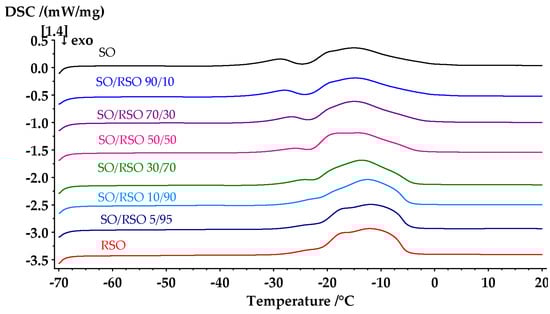 According to the results presented in Figure 1 and Table 5, these three peaks are distinguishable for rapeseed oil and mixtures with a higher concentration of rapeseed oil (up to a ratio of 30/70). These observations may be related to the almost two times higher content of monounsaturated fatty acids in rapeseed oil compared to sesame oil (see Table 1). It is clearly seen from Figure 1 that as the concentration of rapeseed oil increases, the low-temperature peak shifts to higher temperatures from −53.2 °C to −40.9 °C and its enthalpy increases more than twice (from −27.85 J/g to −58.38 J/g). At the same time, the high-temperature peak shifts to lower temperatures (from −9.3 °C to −18.0 °C), and its enthalpy decreases (from −5.575 J/g to −0.308 J/g). These trends may be related to the different fatty acid compositions of the two pure oils.