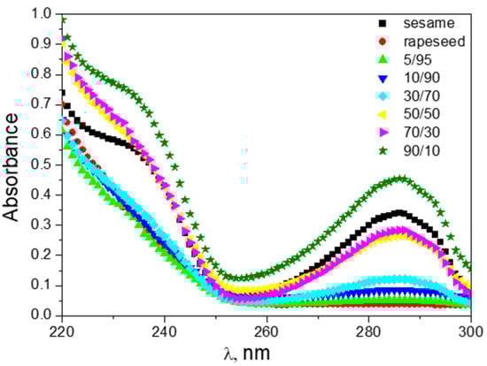 UV spectroscopy can provide information on the quality of the oil, its state of preservation and changes brought about by technological processes. The UV spectra for sesame oil, rapeseed oil and their mixtures used in the study are shown in Figure 3.