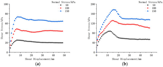 Taking the test results at the shear rate of 1.0 mm/min as an example, the shear stress-shear displacement relationship curves under three distinct normal stresses are presented in Figure 5.