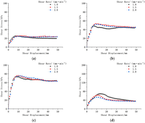 Shear stress–shear displacement curves at different shear rates. (a) S-T0-A; (b) S-T0-B; (c) S-T0-C; (d) J-T10-A; (e) J-T10-B; (f) J-T10-C.