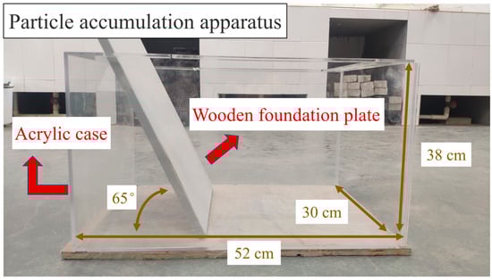 Through the interparticle friction test, the macroscopic parameter of the angle of repose can be related to the microscopic parameter of the coefficient of interparticle friction [29]. The slope accumulation simulation device (Figure 2) is utilized to simulate the process of particle accumulation. The experimental apparatus consists of an upper open portion, a front retractable box, and a base plate acting as bedrock. The box, as shown in Figure 2, measures 52 × 38 × 30 cm, with the angle of inclination of the plate set at 65°.