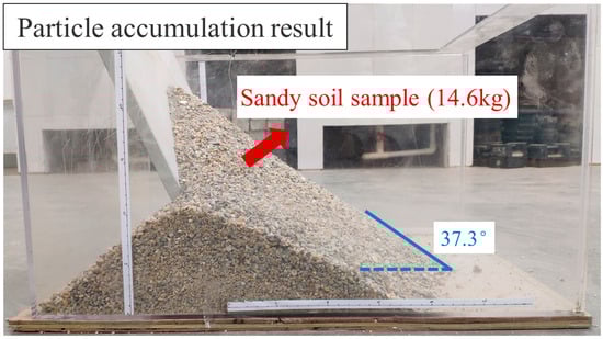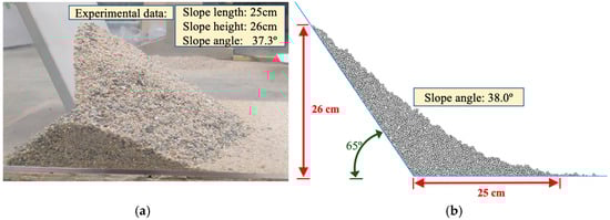 The simulation process followed the interparticle friction test, with particles generated in small amounts multiple times at the midpoint of the ramp (particle size distribution consistent with the sandy soil sample) to avoid excessive impact on the ramp, which could cause particles to jump violently. The particles slid down the ramp, initially forming a pile, and additional particles were added to further pile up on the already formed slope. Eventually, a small-scale slope was formed, and additional particles were continuously poured onto the ramp’s upper section using a small shovel. When the distance from the base of the slope to the ramp matched the interparticle friction test, it indicated the completion of the particle pile-up process. The angle of the slope was measured multiple times using relevant angle measurement software, and the height of the slope was recorded. The pile-up process was compared with the interparticle friction test (Figure 13). The slope length indicates the distance from the bottom of the plate to the leading edge of the slope body, while the slope height represents the distance from the bottom of the plate to the top of the slope body. Additionally, the slope angle denotes the measured angle in the middle of the slope body.