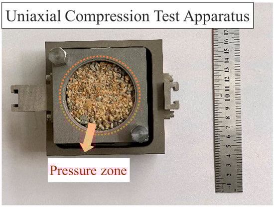 Three sets of repeated uniaxial compression tests were conducted using sand samples, with the setup as shown in Figure 4. The actual operating area of the apparatus is the dashed circular region in the figure, which is the sample loading area, with a diameter of 61.8 mm and a height of 52 mm. The vertical loading setup is consistent with the vertical loading apparatus used in direct shear tests in geotechnical experiments. The loading is applied using standard weights, and the sample is subjected to vertical pressure by a stainless steel cap.