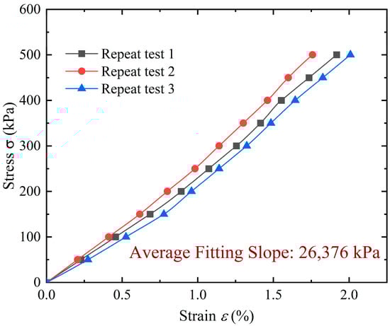 Initially, to eliminate gaps or ineffective contacts between particles, a normal force of 50 kPa was applied to the compacted sandy soil sample for preloading. We applied a preloading pressure of 50 kPa instead of a lighter preload, such as 1 kPa, because lighter pressure is less effective in bringing the particles into close contact. Our goal is to observe the deformation of particles under normal stress; however, particle displacement can complicate the curve. Therefore, we applied a moderate stress to minimize the impact of initial displacement on our observations. Of course, if necessary, 100 kPa could also be used, depending on whether a higher stress is required to induce more significant initial particle displacement. This stress was not designed to be applied over an extended period. This is because the particle size of our material is relatively large, and the particles themselves have a high hardness, so creep has a minimal effect on our material. Then, the sample was subjected to incremental normal loading up to 500 kPa, and the corresponding displacement values were recorded. The relationship curve between normal stress and normal strain during the application of normal load is shown in Figure 5. The relationship between normal stress and normal strain demonstrates a nearly linear proportionality; as the normal load applied to the sample increases, a corresponding increase in normal displacement occurs. The compression modulus of the sand sample was calculated using the formula .