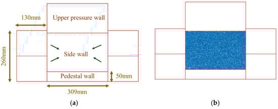 The model size is designed to be five times the size of the uniaxial compression test apparatus (Figure 6). Larger model sizes allow for more particles in the model, leading to more stable simulation results. The model is surrounded by rigid walls forming the boundaries. The side walls provide lateral constraint for uniaxial compression tests, and the upper wall applies pressure using servo principles.