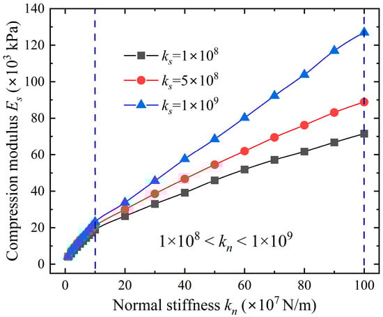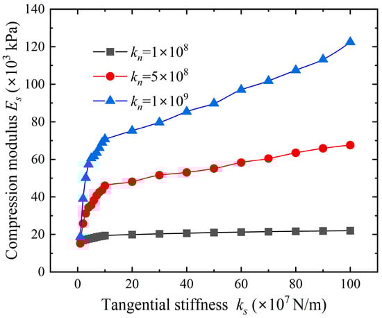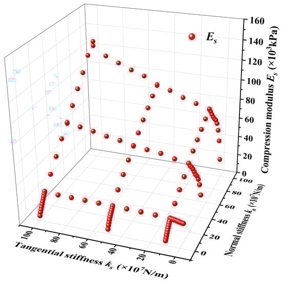 To determine the normal stiffness kn and tangential stiffness ks of the particles based on the macroscopic mechanical parameters of the sand sample, the compression modulus Es was used as a macroscopic mechanical parameter to characterize the elastic deformation capability of the sample. Therefore, the macro–microscopic compression modulus relationship shown in Equation (8) was established.