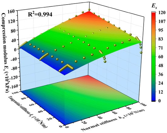 It is evident that when ks or kn is less than 1 108, Es exhibits a higher curvature in space, but both kn and ks are still positively correlated with Es. When kn and ks surpass 1 108, approaches a plane, indicating a relatively strong linear relationship between Es and kn, ks. In Figure 9, it is observed that the points at the intersection of the axes are not perfectly coincident. This discrepancy arises because the particle position distributions generated during simulations using the two methodologies are not entirely consistent. However, it is worth noting that the resulting error remains within an acceptable range. Fitting the data through MATLAB facilitates obtaining Figure 10 and Equation (12).