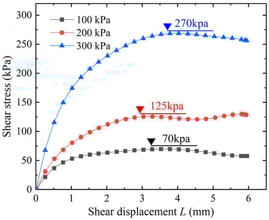 Direct shear tests were conducted on the sample described earlier, with relevant parameters listed in Table 1. During the direct shear tests, the sand samples were subjected to shear under normal stresses of 100 kPa, 200 kPa, and 300 kPa, with a shear rate of 0.8 mm/min (Figure 11). Shear stress increases with increasing shear displacement, but the rate of increase gradually decreases. At a pressure of 100 kPa, the shear stress reaches its peak value when the shear displacement reaches 1 mm, with the final peak value being 70 kPa. Similarly, at pressures of 200 kPa and 300 kPa, the shear displacements at which the shear stress approaches peak values are 3 mm and 4 mm, respectively, with peak stresses of 120 kPa and 270 kPa. It can be observed that increasing the pressure significantly enhances the shear strength of the sand sample, requiring longer shear distances to reach the maximum shear stress.