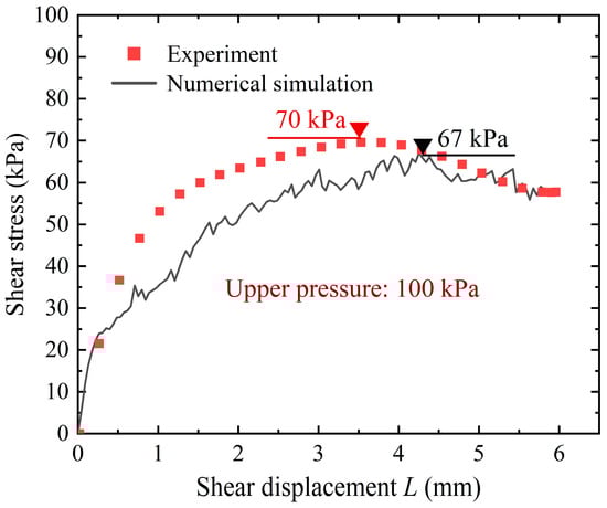 The sandy soil sample parameters and the simulation device used were consistent with those of the uniaxial compression simulation (Figure 6). A normal stress of 100 kPa was applied, and the upper wall was sheared at a rate of 1 mm/min, with the pressure stress maintained using servo principles throughout the process. The shear stress–shear displacement curve of the sand sample was obtained, and the simulated curve was compared with the actual curve (Figure 12).