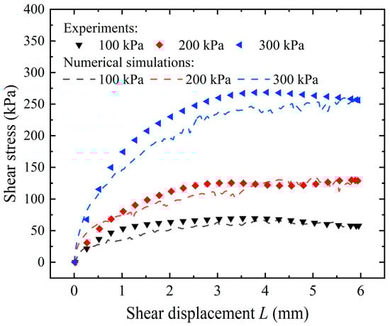 Previously, direct shear test numerical simulations were conducted for particle parameter calibration under a pressure of 100 kPa. We further conducted direct shear test numerical simulations under pressures of 200 kPa and 300 kPa using the same method as before. The obtained shear stress–shear displacement curves under different pressures were compared with the data obtained from direct shear tests (Figure 14).