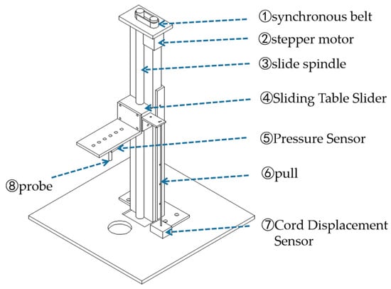 This paper adopts a self-designed penetrometer, which consists of three functional areas, as shown in Figure 1. The driving function area (1) consists of a synchronous belt ①, a stepper motor ②, a slide spindle ③, and a sliding table slider ④, and the probe on the sliding table slider ④ is driven by stepper motor ② to move up and down at the same rate. The detection function area (2) consists of a pressure sensor ⑤, a pull ⑥, and a cord displacement sensor ⑦, which are responsible for detecting the penetration resistance and penetration depth and ensure the accuracy of the detection data while guaranteeing that the detection range is large enough, and they also have the reading and transmission rate once every 100 milliseconds. The monitoring function area (3) is a computer program, which can directly draw and store data in real time according to the data in the detection area to ensure that the detection results are obtained the first time while ensuring the timeliness of data storage. Therefore, although the self-developed penetrometer has little improvement in performance compared with the existing penetrometer, it is able to derive the penetration resistance versus depth curve, which provides the testing conditions for the study in this paper. As shown in Figure 2, In terms of probe design, the penetrometer is equipped with a cylindrical probe with a diameter of 6.2 mm and a height of 6 mm, along with an extension rod with a diameter of 4 mm and a length of 10 cm. The extended probe design provides the necessary experimental conditions to study the variation of penetration resistance at depths up to 10 cm.