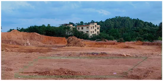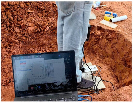 As shown in Figure 3, a relatively flat site was selected in the Yanshan area of Guilin City, and the test area was 5 m × 5 m. Penetration tests were conducted at five locations at the four upper corners of the area and at the intersection of the diagonal lines. As shown in Figure 4, after removing 30 cm of topsoil from the surface layer, penetration tests were conducted on the in situ soil, and samples were collected. The undisturbed samples were used for indoor testing of soil physical and mechanical indices. In addition, the disturbed samples from the Yanshan area in Guilin City and the disturbed samples from the Yaoshan area in Guilin City were collected for indoor testing, and the physical property indexes of the soil samples are shown in Table 2.