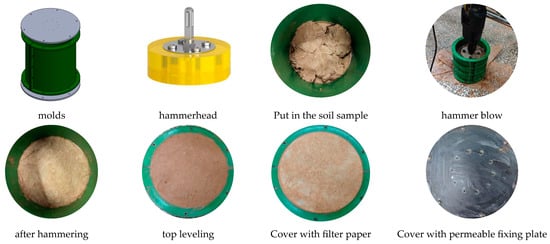 As shown in Figure 6, the sample preparation molds were cylindrical, with a diameter and height of 15 cm and an adjustable opening and closing structure for easy demolding, and perforated steel plates were used instead of traditional permeable stones to improve the consistency of the sample molds. During compaction, an electric pick vibrator was used to combine vibration and impact to ensure uniform compaction of soil samples, effectively removing trapped air and avoiding the phenomenon of “soft top and hard bottom”.