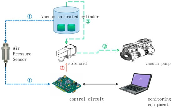 In the saturation stage, a graded pressure control system was used to avoid deformation or damage to the soil sample caused by transient pressure difference by gradually reducing the vacuum. The equipment, as shown in Figure 7, includes a vacuum saturation cylinder, a vacuum pump, a solenoid valve and its control circuit, a barometric pressure sensor, and monitoring equipment. The operation mode is as follows (as shown in Figure 7, line ①): the control circuit receives the pressure sensor readings and determines whether the current pressure belongs to the current stage pressure. If it belongs to the current air pressure, the monitoring of air pressure continues, and if it does not belong to the current pressure, the switch of the solenoid valve must be controlled (as shown in Figure 7, line ②) to vacuum the vacuum-saturated cylinder (as shown in Figure 7, line ③). After the end of decompression, it is also necessary to slowly release the pressure. At this time, it is only necessary to turn off the vacuum pump and change the decompression to pressurization to pressurize to atmospheric pressure in the layers, according to the program.