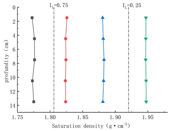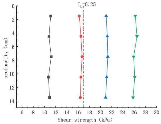 The results of the specimen uniformity test indicate that the method, as shown in Figure 8, Figure 9 and Figure 10, exhibits good uniformity in density, moisture content, and straight shear test; the maximum value of density differs from the minimum value by 0.0038 g/cm3, the maximum value of moisture content differs from the minimum value by 0.8%, and the maximum and minimum values of shear strength differ from the minimum value by 0.6 kPa. In conclusion, the method proposed in this paper provides another solution for the preparation of geotechnical test specimens, which can meet the requirements of penetration test specimens.