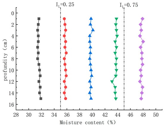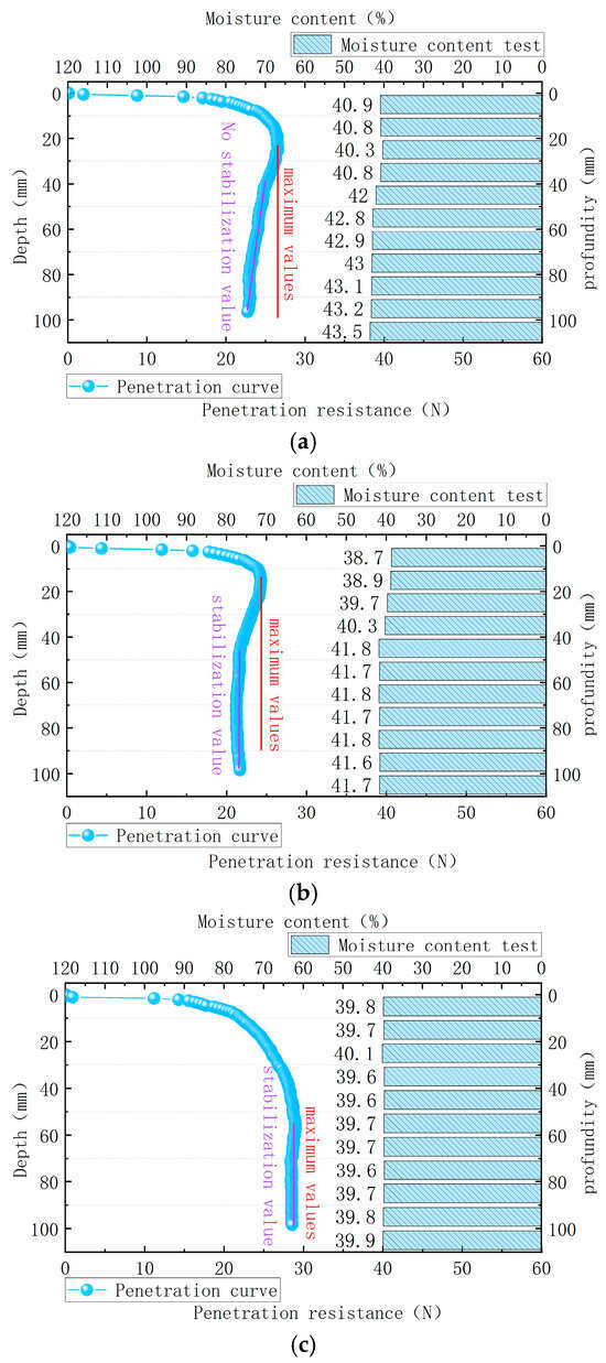 First, the credibility of the curve was evaluated. According to the critical depth theory, the penetration resistance should remain stable or show a slow increasing trend after the penetration reaches the critical depth. When comparing Figure 11a with Figure 11c, it can be seen that Figure 11a does not clearly show a stable value of penetration resistance. When comparing Figure 11b with Figure 11c, it can be seen that the resistance characteristics of Figure 11b show a stable performance, although there is a significant difference between the stabilized value and the maximum value of the penetration resistance. Further comparison of the water content test results corresponding to the different curves shows that a decrease in water content leads to an increase in penetration resistance and vice versa, i.e., an increase in water content leads to a decrease in penetration resistance. Therefore, Figure 11c shows the penetration curve of soil samples with uniform water content.