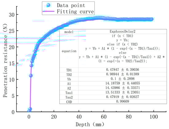 By searching for the best fitting function to the penetration curves of 50 sets of homogeneous soil samples with uniform water content and screening the function with the highest frequency in terms of the AIC value ranking, the final suitable fitting function was determined to be the ExpAssocDelay2 function. The correlation coefficients obtained by using this function to fit the penetration curves of Figure 11a,b were 0.84 and 0.87, respectively, so the influence of inhomogeneous soil conditions on the test results can be eliminated.