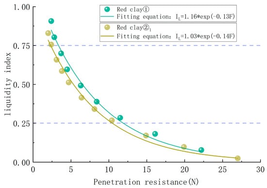 The above data processing method was applied to extract the penetration resistance from the penetration test curves of the two types of disturbed red clay samples, while normalizing the water content to the liquidity index. The results of fitting the penetration resistance to the liquidity index for the two types of red clay soils are shown in Figure 13. Both types of red clays show the phenomenon that the value of soil penetration resistance decreases as the liquidity index increases.