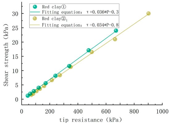 As shown in Table 3, a pocket penetrometer test study was conducted. As described in Section 2.3, two kinds of red clay (red clay ①, red clay ②1) were configured into three different states of red clay specimens; the indoor penetration test, moisture content test, direct shear test were carried out six times for each water content, and the standard value was taken as the test result after statistical analysis. Using the test results, empirical formulas for the penetration resistance and liquidity index, penetration resistance, and shear strength were established, and the effect of the plasticity index on the empirical formulas was investigated.