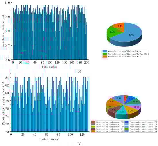 Firstly, the method in 2.5 was used to evaluate the curve credibility, and the results are shown in Figure 15a. Among the 200 sets of test curves, there are test curves with correlation ratios lower than 0.8, but the curves with correlation ratios higher than 0.90 account for the largest proportion. The reason for this phenomenon is that the site environment is complex, and the presence of holes and small stones in the soil layer may cause a deviation of the penetration curve. However, the test probe is small, and the extent of influence on the soil body during penetration is also small, so the probability of the penetration process being affected by the holes, small stones, and other factors is small. In order to reduce the influence of abnormal test data on the test results and to obtain more accurate field penetration test results, this paper considers only the test curves with correlation relationships higher than 0.90 for the extraction of stable values of penetration resistance. The statistical results are shown in Figure 15b, and the value of penetration resistance is 75–84 N.
