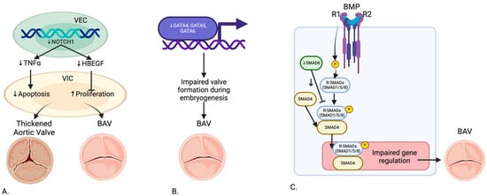 Genetic Pathway of (A) NOTCH1, (B) GATA, and (C) SMAD6 in the development of BAV. Created in BioRender.com.