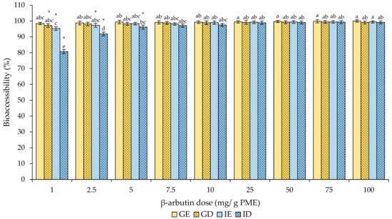 Percentage of in vitro bioaccessibility of β-arbutin. Bars represent means (n = 3) ± SD. Means followed by different superscript lowercase letters differ significantly (p ≤ 0.05). Asterisks indicate a statistically significant difference with 100% bioaccessibility (p ≤ 0.05). PME—plant material equivalent, GE—gastric electrolyte treatment, GD—gastric digestion, IE—intestinal electrolyte treatment, ID—intestinal digestion.