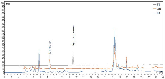 Chromatograms at 280 nm of the standard solution and in vitro bioaccessible fractions for the lowest dose of β-arbutin (1 mg). ST—standard solution of β-arbutin (12.5 µg/mL) and hydroquinone (12.5 µg/mL), GD—gastric digestion, ID—intestinal digestion. The other peaks that do not correspond with the standards represent digestion chyme components.