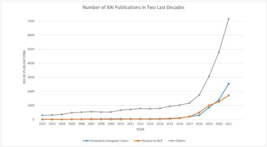 Within the broader fields of artificial intelligence (AI) and computer vision, explainable artificial intelligence (XAI) is gaining growing significance. It is characterized by the development of various techniques and approaches aimed at interpreting and elucidating the predictions generated by complex deep learning algorithms []. This rapidly growing field focuses on enhancing the transparency and interpretability of AI systems for human users, fostering trust, and facilitating the effective management of these complex “black box” models. The relevance and growth of XAI can be attributed to the widespread adoption of deep learning solutions across diverse industries. In tasks such as natural language processing, autonomous decision-making, and image recognition, deep learning models have proven highly effective. However, they often operate as opaque systems, making it challenging for users to grasp how and why specific predictions are made. This opacity can be particularly problematic in critical applications such as healthcare, finance, and autonomous vehicles, where accountability and interpretability are paramount. XAI aims to close this gap by creating machine learning techniques that allow humans to better understand, trust, and manage AI systems effectively. These techniques serve as a means to uncover the decision-making processes within deep learning models. XAI offers clear explanations for model predictions, enabling users to make informed decisions based on AI recommendations while also helping developers improve the model’s robustness and fairness. With the growth of deep learning solutions in all industries, it has become relevant to understand the interpretation or internal representation of these ‘black box’ models. Explainable artificial intelligence develops a set of machine learning approaches that empower human users to understand, trust, and control the next wave of artificial intelligence partners [,,]. Given the high complexity of deep learning models, it becomes challenging to understand and assess the internal decision process underlying predictions. In the case of images, explainability describes which parts of an image caused the model to predict specific classifications. Image explanations are essential for two different groups of people, model stakeholders and model builders. For image models, each pixel is considered an individual feature and the explanation method assigns an attribution value to each pixel. Figure 2 describes the scenario with and without explainable artificial intelligence. Unlike the traditional deep learning approaches which help in future predictions, explainable AI models provide the reasoning behind the predictions. For explainability models, two elements draw attention along with the new machine learning algorithm, as shown in Figure 2 []. One of them is the explanatory model and the other is the explanation interface.