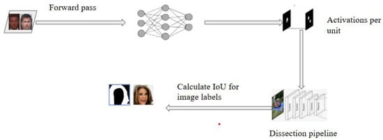 After analyzing and understanding the different explainable artificial intelligence methods for interpreting deep learning models, this research work will focus on the network dissection algorithm [,]. Network dissection is defined as an interpretability technique for convolutional neural networks (CNNs) that provides relevant labels to their individual hidden units. This method has been used to quantify the interpretability of the deepfake detection model to provide the explanation behind the classification of images as fake. In [], the researchers suggested a general framework for network dissection for interpreting and quantifying the deep visual representations of convolutional neural networks by estimating the mapping between semantic concepts and individual hidden units. The authors have used Broden as the dataset, which is referred to as a broadly and densely labeled dataset, and tested the method on different CNNs such as ResNet, AlexNet, VGG, and GoogLeNet, all of which are trained on objects and scenic concepts.
